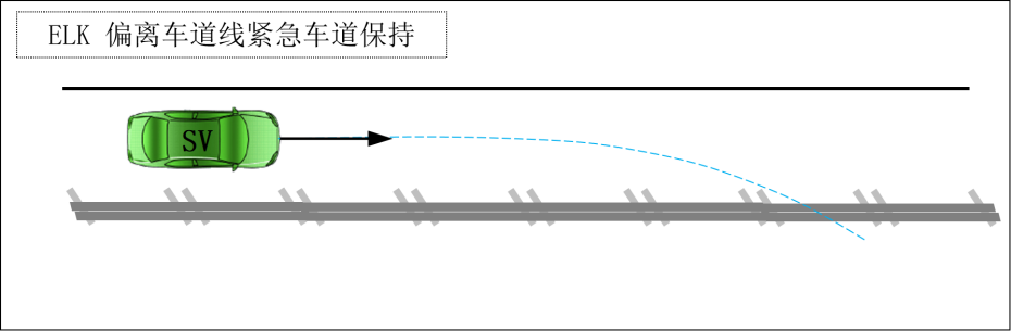 本测试在长直道路上进行,车道分割一侧为实线和波形护栏,或仅有波形护栏。若车俩的ELK系统的最低激活车速≤72km/h,则试验车速为72km/h;若车俩的ELK系统最低激活车速>72km/h,则试验车速为制造商申报最低激活车速+1km/h。当车速稳定时,车辆向有护栏一侧偏离,模拟车辆偏离车道的交通事故,考察车辆ELK功能在真实道路中偏离车道紧急车道保持,避免与护栏发生碰撞的能力。